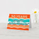 Det här är ett kort på 50-årsdagen för medarbetare i färgad med rött, orange och jade som innehåller vågar i färg och texten, LYCKLIG ANNIVERSARY i en roligt stripy, flytande typsnitt. Överst finns texten 50 år, med ett kontrasterande, enkelt, fet stil med orange och en vit mönstrad detalj. Kortdesign av Natalie Kinnear