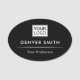 Svart, elegant, ovala namn bricka med ditt namn, titel och anpassningsbar logotyp. Ditt namn och din titel är åtskilda av en vit delare. Du kan byta typsnitt och färg, flytta och ändra storlek på logotypen och andra inslag med verktyg.