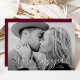 Meddela din förlovning med elegantens meddelanden om fotoförlovning! Meddelandet innehåller ett foto av förlovningen för vågrät med fullt-utfall med "Vi är engagerade!" i ett vanligt vitt skript. Anpassa meddelandets framsida till namn och detaljer som du vill inkludera. Förlovningen återgår till visningen av en solid burgundär bakgrund med utrymme för ytterligare foton och text.