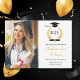 Fira i stil med detta enkla och snyggt studenten-annonskort. Lägg till ditt favoritfoto och information. Konstruktionsklassen 2025 i elegantens skript med illustration av lagerkrans, hylsa och diplom. Ett foto av student med namn och detaljer i en blandning av snyggt svart och guld på en ren vit bakgrund. Kortets baksida har en kopia av lagerkransens utformning. Enkel att anpassa. Grattisar!