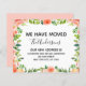 Budgetpersikan - Coral och Eucalyptus Greenery Modern och Elegant Blommigt Watercolor Vår Vi har Flyttat New Home eller Ny adress Card - innehåller vackra och elegant manustypografi med moderna botaniska blommor och grönenergi för speciella New Home eller Nya adress firande.
