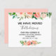 Budgetpersikan - Coral och Eucalyptus Greenery Modern och Elegant Blommigt Watercolor Vår Vi har Flyttat New Home eller Ny adress Card - innehåller vackra och elegant manustypografi med moderna botaniska blommor och grönenergi för speciella New Home eller Nya adress firande.