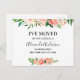 Budgetpersikan - Coral och Eucalyptus Greenery Modern och Elegant Blommigt Watercolor Vår I har Flyttat New Home eller Ny adress Card - innehåller vackra och elegant manustypografi med moderna botaniska blommor och grönenergi för speciella New Home eller Nya adress firande.