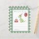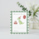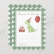 Vattenfärgen barns födelsedag party. Vattenfärg Dino i födelsedagshatt, tårta med ljus, röd ballong. Gröntens burbakgrund.