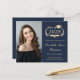 Modern budgetvänlig mörk blått universitetsexamen med en "klass av" i ett belysande illustration av lagerkrans i guld, med en graderingshäftare och diplom, ett foto av student och deras namn i ett skript med elegant light guld. Lägg till deras skola, stora, ära eller framtida planer. Den här pappra för halvblank i budgeten är ungefär lika viktig som fotopapper. Det finns också en större version av det traditionella kortet lagrar 5 x 7 (meddelande om länken).