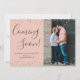 Guld Confetti på Rosa Photo Gravid annonskort. Förväntar föräldrar! Modern stavad typografi "kommer snart"-skriptkort för att dina lycklig-nyheter med familj och vänner. Funktioner ovan och grund guld konetti ram på lätt rosa. Kontakta mig om du behöver hjälp eller matchande artiklar! Du kan anpassa designen genom att ersätta enkla texter och lodräts foto. 3351