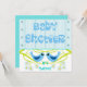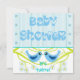 Bjukskjortans inbjudan-meddelande. Inbjudan din familj, dina släktingar och vänner till ditt barn duschar party med denna söta inbjudan med två vackra blå födslar på en kalk gren med blåa blommor. Ord Baby Shower är skriven i ett vackert blått teckensnitt med hjärtan på blå stripe-bakgrund.