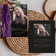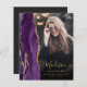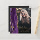 Trendigets tillkännagivande från 2025 om studenten har en vattenfärgad agate geode gräns i skuggor av lila med höjdpunkter från guld glitter. Student först namn visas som ett handskriftsskript för elegant guld-färgad på ett lodrät-foto, tillsammans med efternamnet, skolåret och klassåret i typsnittet. Ett filter för svart övertoning hjälper till att trycka på texten. Ett andra foto visas på baksidan, tillsammans med meddelandet och detaljer i guld-färgad-texten på en mörk med svart bakgrund.