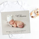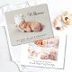 Minsta budgetvänliga 5-foto-födelsemeddelande. Ditt nyfödda foto fyller framsidan med överlagret "Välkommen" i ett skript för contemporary (du kan flytta den här texten till ett annat område på kortet till kostym genom att välja "anpassa ytterligare"). Lägg till hans eller hennes namn, ankomstdatum och födelsestatus. Lägg till ytterligare fyra familjefotografier på baksidan, ett "välkommet" meddelande och moderns och syskon namn.