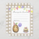 En liten sötpotatis. Vattenfärgen barns födelsedag party. Vattenfärgssöt potatiskawaii i födelsedagshatt, tårta med bär, lila ballong, flaggor festträdgård. Beige-brun burbakgrund.