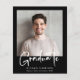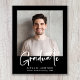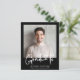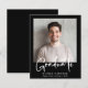 Ett budgetvänligt, modernt, svart studenten-meddelande som innehåller ditt foto och "Student" i ett snyggt med fetstil, vitt skript. Lägg till klassens namn, skolår och klassår i enkel vit typografi.