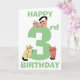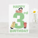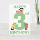 Cute, tredje roligtens (tredje) födelsedagskort med stort nummer tre i färg-grönten. En dörr kattunge ligger sitta ovanpå siffran och två dockor kattunge ligger sitta vid basen av siffran, varje katt är unik med ett annat färg och i en annan position. Ovanför och nedanför kattarna är ord Lycklig (högst upp på kortet) och födelsedag (grund på kortet) i grönt. Inuti kortet hittar du ännu mer söta katter med en mall för att lägga till ditt födelsedagsmeddelande och slutligen en annan doodle-katt på kortets baksida.