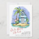 Beach Tropical Watercolor Flytta Announcement har en vattenfärg i roligten på ett strandhus på en tropisk ö med handflatan träd och blommor. Nedan står texten "Vi har flyttat till stranden" i moderna, handskrivna kalligrafiskript med text nedan som ny adress och anpassningsbar. Designad av ©Evco Studio www.zazzle.com/store/evcostudio