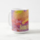 Väggen, i den ursprungliga konstnärliga verket av ZoeSPEAK på denna inspirerande mugg, är en gammal röd tegelvägg med en muralmålning på puts som håller på att smula sönder. Muralmålningen är en bild av luddiga moln i solnedgången, alla rosa och klart gula längst upp mot en djupblå himmel. Meddelandet är att släppa in solskenet.