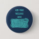 Lägg till ett eget meddelande eller ett namn om du vill skapa en knappnål eller knapp för personlig av roligt. Den här rundade knappen har en nedtryckt illustration av en återförslutningsbar stil-kamera i tårblått med ett eget meddelande i koordinattexten ovan och är inställd mot en marin blå bakgrund.