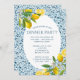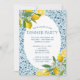 Utformningen har en blå mosaikbakgrund med citroner i motsatta hörn. Perfekten för ett italienskt, Medelhavsbaserat eller Amalfi Kusten inspirerade party!