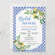 Medelhavsblå plattor Ro Lemon Inbjudningskort för möhippan Modern citron, inbjudningskort för möhippan med blå och vit bakgrund, vit dekorativ ram, citroner, vit ros och blommar.