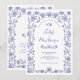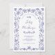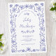 Om du vill ha en unik bröllopsinbjudan som känns lugn, elegant och väl sammansatt, klarar denna medelhavsinspirerade blommiga design jobbet åt dig. Den känsliga blå och vita vildblomsillustrationen skapar en mjuk, tidlös look som passar allt från kustfirande till avspända trädgårdsbröllop, och hjälper dig att sätta tonen från det allra första intrycket. Denna design är idealisk om du siktar på en sammanhängande, stilren bröllopsestetik utan att komplicera saker och ting, med en matchande svit tillgänglig så att din brevpapper passar vackert ihop. Den skannbara QR-koden och informationen om bröllopswebbplatsen på baksidan gör det enkelt för dina gäster att svara och se all bröllopsinformation enkelt. Det är perfekt för par som planerar ett destinationbröllop, en sommarcélébration eller ett klassiskt blått och vitt tema, och fungerar särskilt bra för lokaler vid havet, landsbygdshotell eller ljusfyllda inomhusutrymmen.
