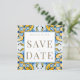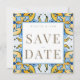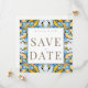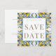 Vit och blå samt gult Medelhavsruta med Guld Text Spara datum. Bröllop. Contemporary och modern. Enkelt. Fyrkantig.