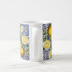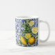 Hand målade traditionella plattor från Portugal med citroner från Medelhavet. Mönster av perfektion. Azulejo, blå och vit blommigt, löv-platta teckningar. Perfektens dekorativa utformning, idealisk gåva till alla tillfälle. En vacker sommardesign i Medelhavsområdet som skildrar citroner av gult med deras gröna och blommar mot en blå och vit vintage i Portugal mönster.