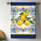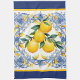Medelhavsplattor och vackra citronbukett kökshanddukar. Vackra citroner på en blå och vit medelhavsplattor bakgrund. Du kan lägga till text för att anpassa.