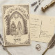 Fånga andan av en medeltida romans med detta exklusivt designade "Spara datum"-kort. Med en dramatisk gotisk båge och en symbolisk drake visar illustrationen en riddare och hans brud redo att börja sin livslånga resa. Den rika detaljrikedomen och den klassiska estetiken gör detta kort till en perfekt inledning till ett bröllop med historisk, fantasy- eller gotisk atmosfär. Det är mer än bara ett meddelande; det är ett konstverk som förebådar den magiska dagen som kommer. Detta unika vykort är idealiskt för par som planerar ett bröllop med historiskt, fantasy- eller gotiskt tema.