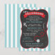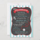 Super rolig examen från sjuksköterske- eller läkarutbildningen festinbjudan med feta ränder och en svart tavla i mitten med stetoskop, banderoll och krita typsnitt. Handritad illustration av McBooboos.