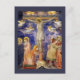 Den medeltida scenen Bra Fredag med Kristus på Kor omgiven av änglar. Riktig färgad i blues, gyllene gulter och orange.