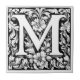 Medieval Illuminated Brev M Ceramic Tile A black and white vetor illustration of the brev i en utvecklad medeltida stil, skapat i stil i Albrecht Dürer. Utformningen är en kvadrat med en stor motiv för den centrala blommigten omgiven av symmetriskt geometriskt mönster och snurrar.