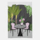 Jag skapat detta digitala teckning efter att ha inspirerats av en liten kaffebryggare, omgiven av en tropisk trädgårdsgård, med kaskadande vy, monstera löv, handflatan och en rosa medinilblomma bord.