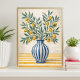 Bring a touch of Mediterranean charm to your space with this elegant hand-drawn botanical illustration. This artwork features delicate lemon branches with lush green leaves arranged in a classic blue striped ceramic vase, creating a warm and rustic still life composition.