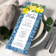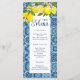 Modern och elegant vit och blå meny. Designen har ett par citroner med löviga stjälkar och en bakgrund med mediterrant kakel. Anpassa den enkelt med dina bröllopsdetaljer.