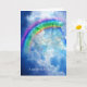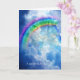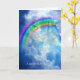 Detta sympatikort har redigerbara textfält både utanpå och innanför för att uttrycka din medkänsla till en kattmamma eller -pappa vid förlusten av deras älskade katt. Bilden visar en katts ansikte bakom himmelska moln och en regnbåge.