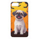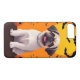 Tecknad-stil illustration av en leende pug sitta framför en pulserande orange bakgrund. En stor gult fullt stigning bakom sig, omgiven av svart fladdermus. På båda sidor av puggen finns två kardade Halloween-pumpor, var och en med ett eländigt ansikte.