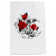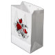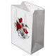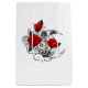 Kontur, mekanisk krescent måne med växlar, dekorerad med röd ros med svarta spetsar och löv på vit bakgrund. Steampunk