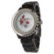 Kontur, mekanisk krescent måne med växlar, dekorerad med röd ros med svarta spetsar och löv på vit bakgrund. Steampunk