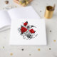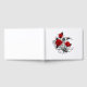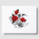 Kontur, mekanisk krescent måne med växlar, dekorerad med röd ros med svarta spetsar och löv på vit bakgrund. Steampunk