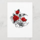 Kontur, mekanisk krescent måne med växlar, dekorerad med röd ros med svarta spetsar och löv på vit bakgrund. Steampunk