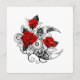 Kontur, mekanisk krescent måne med växlar, dekorerad med röd ros med svarta spetsar och löv på vit bakgrund. Steampunk