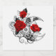 Kontur, mekanisk krescent måne med växlar, dekorerad med röd ros med svarta spetsar och löv på vit bakgrund. Steampunk