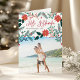 Skicka semesterhälsningar till vänner och familj, ön-stil, med våra tropiska helgdag. Designen innehåller ditt favoritfoto med den hawaiiska julen "Mele Kalikimaka" i röd handskriven typografi, försedd med vibranta röda poinsettiska blommor och holly löv som kaskade över fotot. Anpassa med namn och det år du är instoppad i designen. Anpassa insidan med ett meddelande och en signal om anpassningsbar, accentuerat med en bild av ananas vid jul som är fylld med motsvarande botaniska helgdag.