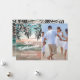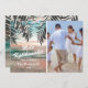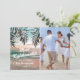 Hawaiiansk glad jul semesterkort med ett foto på din familj, orden "mele kalikimaka", en strandbakgrund, palmlöv och strängljus.