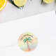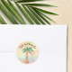 Dessa Mele Kalikimaka Stickers dekoreras med en handmålad handflatan träd som dekoreras med ljus och bubblor på en vattenfärgad bakgrund. Ursprunglig vattenfärg © Michele Davies.