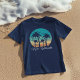 Den här söta hawaiiska julskjortan i party har en tropisk strandsolnedgång på en coola blå bakgrund med teckning i handflatan vid kusten mot ett solnedgång i havet. Mele Kalikimaka skrev i kursiv typografi på den här söt helgdag.