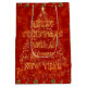 JOY, KÄRLEK & PEACE - elegant presentsäck med vacker grönt Julgran dekorerad med färgstarka prydnadsföremål och mousserande ljus mot röd bakgrund. Swirling stjärngnistor och, God jul och Gott nytt år på baksidan (helt anpassade).