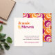 Inspirerad av den fängslande modernistiska eran från mitten av 1900-talet, med intrikata geometriska blommönster från den tiden, visar inbjudan en harmonisk blandning av livfulla färger, inklusive lila, rosa, orange och gul, mot en lugn krämfärgad bakgrund. Noterbart är att inbjudan använder ett slående färgschema genom att namnen framträder i två kontrasterande färger: lila och orange. Detta konstnärliga val tillför en dynamisk dimension till den övergripande designen och fångar essensen av modernistisk estetik från mitten av 1900-talet med en samtida twist.