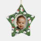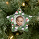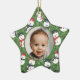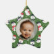 Baby's first Christmas photo ornament with a fun pattern with cute white mellow smiling snowmen in candy cane red and dark indigo blue hats and scarfs set on a bright Xmas green background with line drawn flowers and holly. The photo and "Brandon's Merry First Christmas!" text are fully customizable using the Zazzle template functions. This design is part of the Mellow Snowmen Xmas collection where you will find many matching snowman products like cards, stickers, gift wrap, ribbons, gift tags, pillows, custom stockings, and much more. There is also a Mellow Snowmen Christmas collection that uses the same snowmen pattern in trendy neutral terra cotta colors. The cute baby boy stock photo is by Christian Bowen on Unsplash. Merry Christmas!