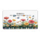 En vit vattenfärgsillustration som skildrar ett piano tangentbord sammanflätat med vibrerande röda, gult och vita vilda blommor. Butterflies fladder omsorgsfullt ovan, åtföljt av flytande musik noter, medan en liten fågel förekommer bland blommarna. Mjuk stänk av färg dropp från pianot, som blandas i en drömmande, konstnärlig bakgrund som fångar harmonin mellan musik och natur.