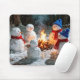 A group of snowmen gathers around a cozy campfire in a picturesque winter forest, their frosty figures gradually melting away as they bask in the warmth of the flames