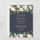 En inbjudan till elegant om en begravningsminnesgudstjänst i marinblått, med vita vattenfärgade blommigtar. Copyright Elegant Inbjudan, alla höger reserverade.